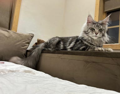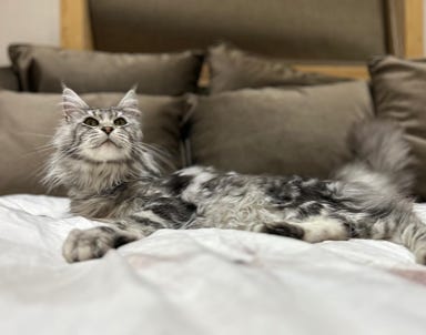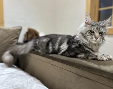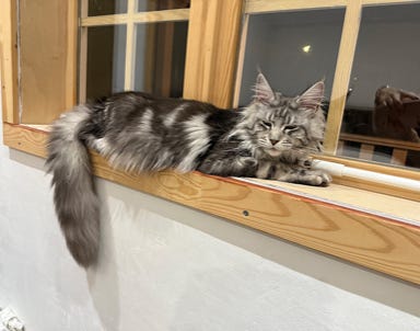Karakter: Super lieve en sociale poes die enorm betrokken is bij onze gezinsactiviteiten. Ze is erg gehecht aan ons en ligt graag bij ons op de bank of op schoot. Ze is zoals een Maine Coon hoort te zijn ook erg ondeugend in de keuken en speels.